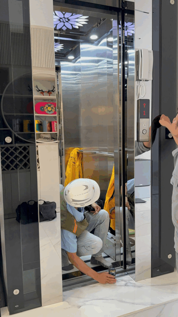 Sau khi lắp đặt hệ thống điện xong, kỹ sư cần phải căn chỉnh lại thang máy cho hoàn chỉnh để tiến hành chạy test thử thang máy.